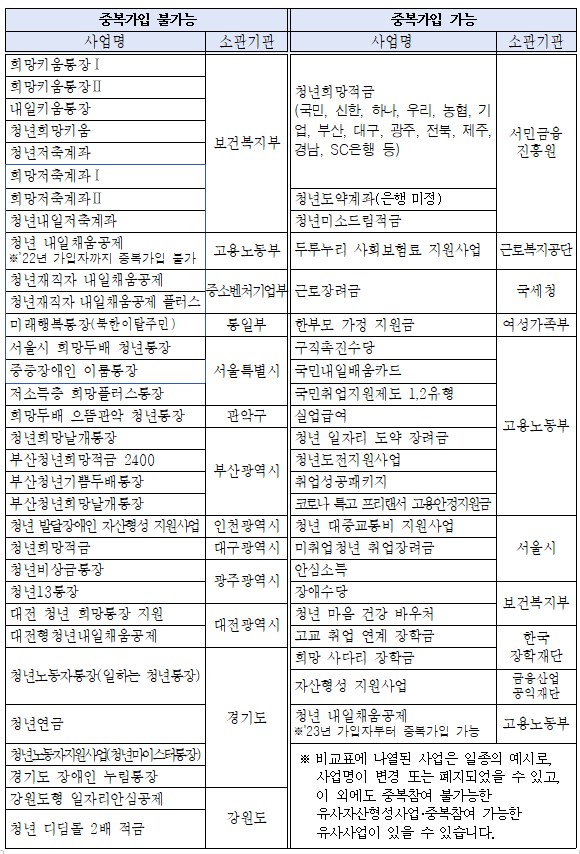 따라서, 서울시 청년희망 두배통장이 어떤 사업과 중복으로 신청이 가능한지 반드시 확인이 필요 하겠습니다.