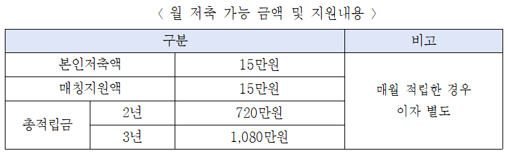 ▷ 예를 들어, 월 15만원씩 3년간 꾸준히 저축하면, 만기 때 본인 저축금액 540만원에