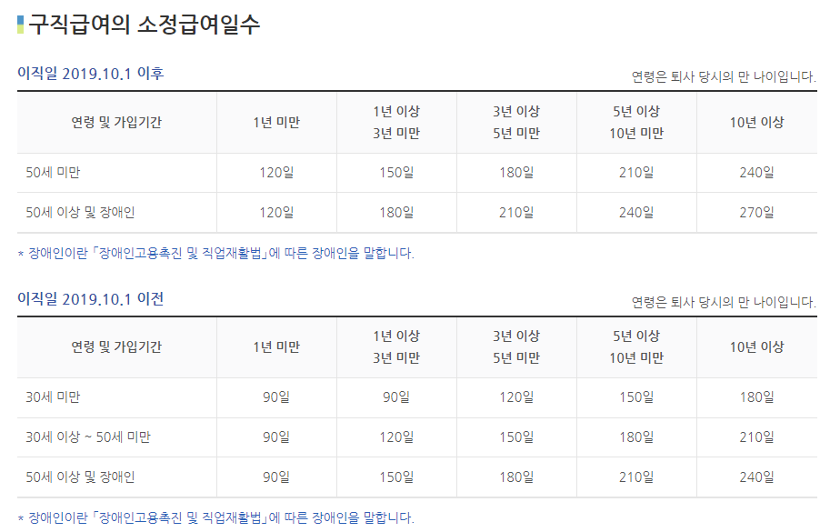 소정급여일수는 이직일 및 연령에 따라 최소 120일에서 최대 270일까지 지급되며, 가입기간 및 연령에 따른 소정급여일수는 아래 표와 같습니다.