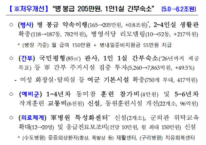 이번 예산안 편성시, 군인 처우 개선에 대한 계획도 함께 포함이 되었습니다.