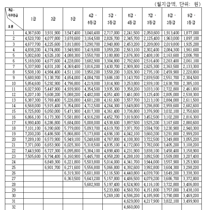 대한민국의 공무원 봉급체계는 호봉제를 기본으로 하고 있습니다. 호봉제란 매년 정기승급을 통해 해당 공무원의 호봉이 올라가는 제도로서, 근속 연수에 따라 급여액이 증가합니다.