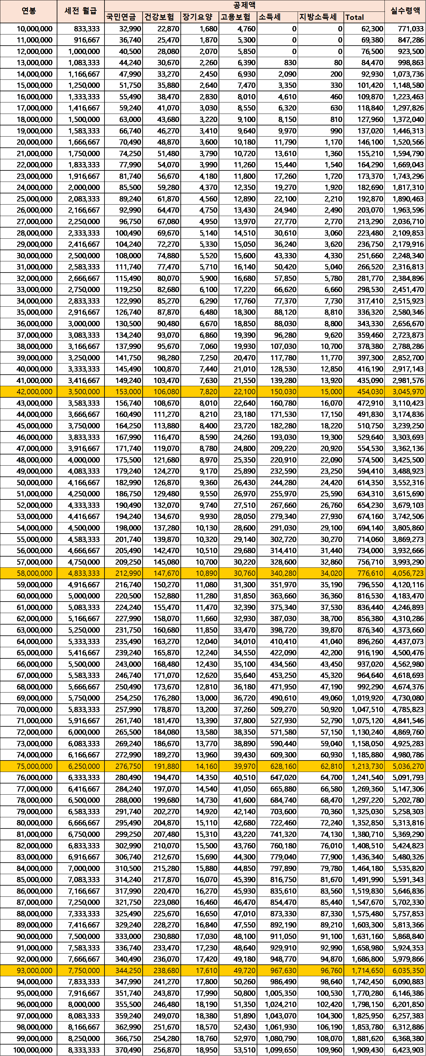 통장에 300, 400, 500, 600만원 이상 찍히려면 어느 정도 연봉이 되어야 하는지 표시해두었습니다.