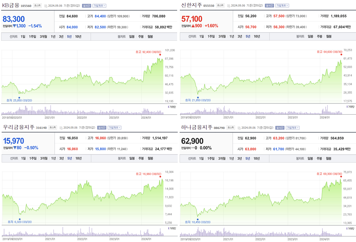 하지만, 최근 밸류업 프로그램에 따른 수혜주로 금융주들이 급부상하면서, '24년 초부터 금융주들이 주가가 급상승하고 있는 추세입니다.