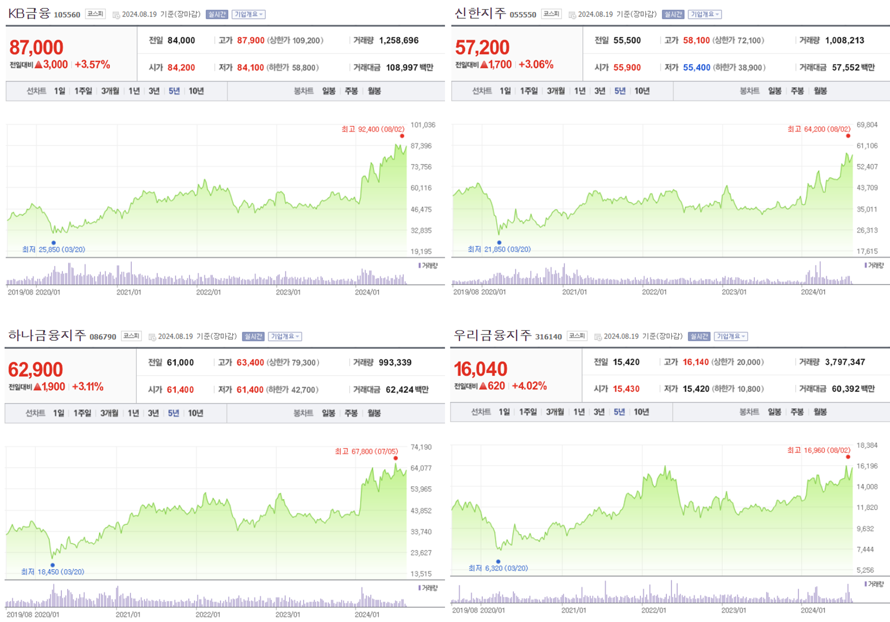 지난 5년간의 4대 금융지주 주가를 살펴보면, 코로나 시기를 제외하곤 큰 변동 없이 보합세를 유지하고 있었습니다.  사실 그래서 주식 자체의 매력이 크지는 않았지만, 배당수익률이 꽤 괜찮은 주식들이다 보니, 배당 관점에서 접근하시는 편이 좋았습니다. (또한, 4대 금융지주 모두 분기 배당을 실시하고 있습니다.)