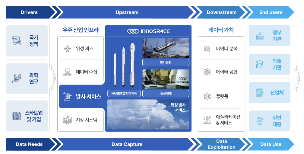 이노스페이스는 우주산업에서 Upstream에 속하는 발사체 제작 및 발사서비스 제공을 수행하고 있습니다. 우주산업의 밸류체인은 크게 위성제조 - 위성발사 - 위성운용 - 위성서비스로 구성됩니다. 발사체/위성의 제조와 발사 부분을 Upstream, 위성 운용과 위성 데이터 활용/서비스 부분을 Downstream으로 구분할 수 있습니다. 과거에는 국가기관과 소수 기업이 밸류체인 전 과정을 담당하였으나 저비용, 대량생산, 상용부품 사용이 가능해지며 부품, 체계, 발사, 운영 등 서비스가 분화하고 각 역할을 개별 기업이 담당하도록 세분화되었습니다. 이노스페이스는 우주산업의 밸류체인 중 Upstream 영역의 발사체 제작 및 발사서비스 제공 수행을 목표로 하고 있습니다.