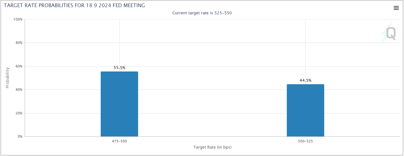 CME FedWatch Tool은 현재 9월 FOMC에서 연내 처음으로 금리가 인하될 것으로 전망하고 있습니다.