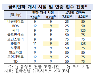 아래 표와 같이, 한국은행 뉴욕사무소에서 진행한 조사에서, 모든 조사대상 기관이 9월에 금리인하를 개시할 것으로 전망한 가운데, 금년중 인하 예상폭은 50~125bp로 지난달보다 확대되었습니다.  75bp (0.75%) 인하를 예측하는 기관이 5곳으로 가장 많았고, 그 외 50bp or 125bp 인하를 전망하는 곳도 각각 3곳과 2곳으로 그 뒤를 이었습니다.