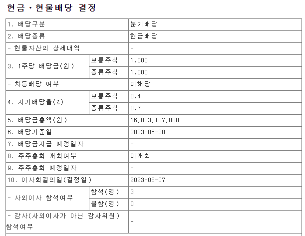 배당금 : 1,000원 / 주 (보통주 주가 대비 0.4%, 지난 1분기 배당금액과 동일)