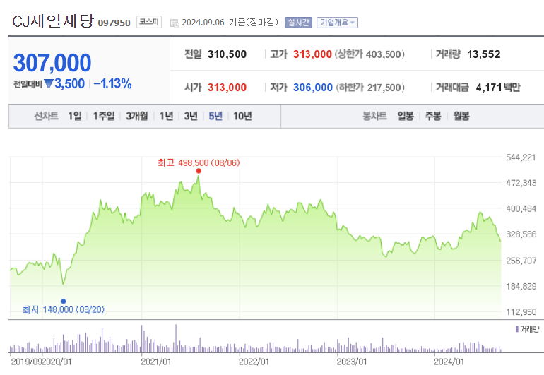 1. CJ제일제당 주가CJ제일제당의 최근 5년간의 주가를 보면, 코로나 기간에 급등 한 이후로 약보합세를 기록하고 있었습니다만, 최근 음식료품 기업들이 수출이 호조를 보이며, 대부분의 음식료