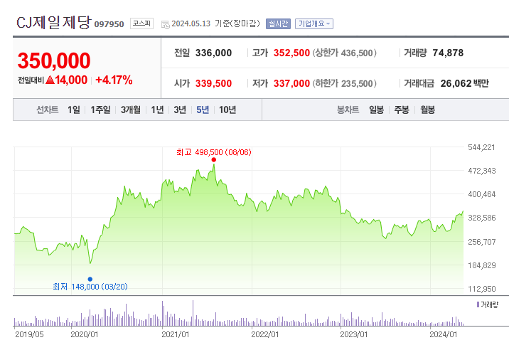 CJ제일제당의 최근 5년간의 주가를 보면, 코로나 기간에 부침을 다소 겪긴 했지만, 현재는 코로나 이전과 비슷한 수준의 주가를 유지하고 있습니다. 최근 음식료품 기업들의 수출이 호조를 보이며, 대부분의 음식료품주가 최근 한 달 사이 주가가 상승하는 모습을 보이고 있고, CJ제일제당 역시 최근 유사한 추세를 보이고 있습니다.