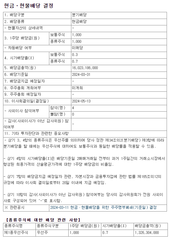 배당금 : 주당 1,000원 (보통주, 우선주 동일)
