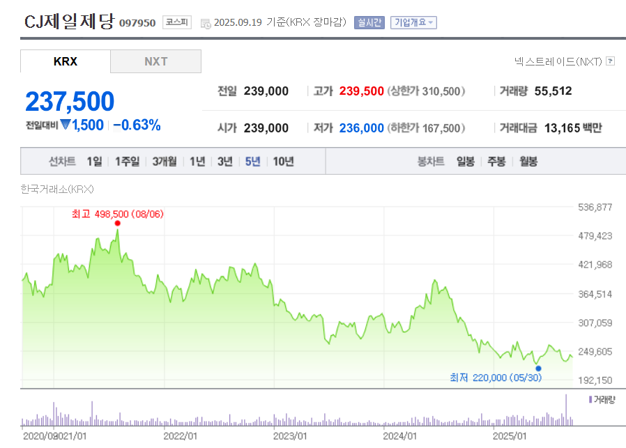 CJ제일제당은 식품과 바이오 사업이 주요 축으로, 최근 글로벌 식품 수요 회복 기대, 바이오 부문 실적 개선 가능성이 주가에 긍정적으로 작용하고 있습니다. 그러나 원자재비 상승, 물류비 부담 등이 수익성에 일부 부담을 주고 있으며, 경쟁 심화 또한 주가 흐름에 영향을 미치는 변수입니다.