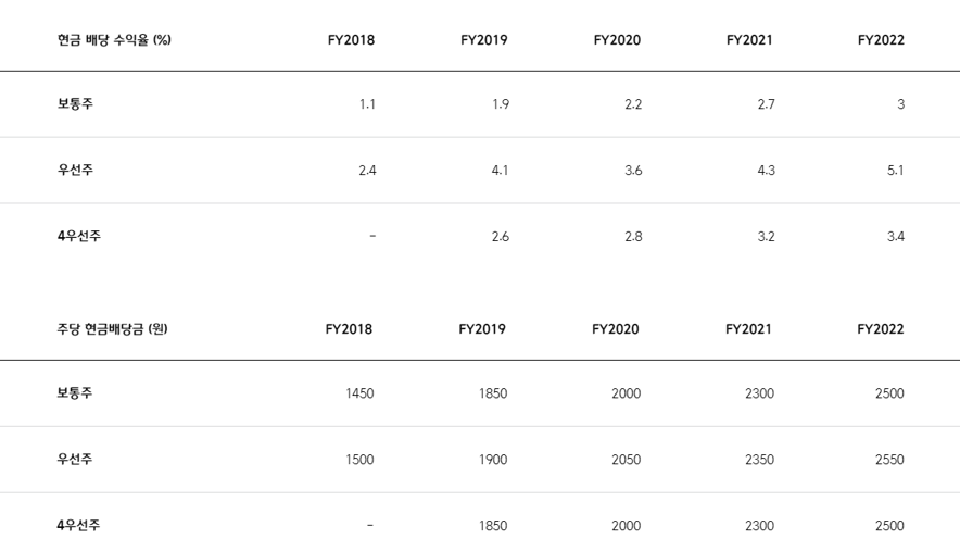 CJ는 지속적으로 배당을 지급하고 있으나, '23년은 이전 대비 주당 배당금이 감소하였습니다.
