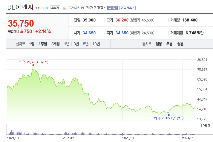 지난 '22년부터 이어진 원재료 가격 상승에 따른 수익성 악화로 DL이앤씨의 주가는 지속 하락 후 보합세를 유지하고 있습니다. 건설 경기가 회복세를 타는 시점에 주가 역시 다시 훈풍이 불지 않을까 생각해봅니다.