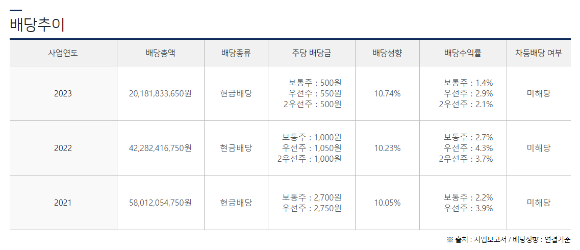 배당금 : 500원 (보통주) / 550원 (우선주) / 500원 (2우선주)