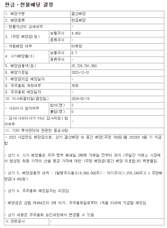 2023년 연간 배당금 (2분기, 결산 배당 진행)