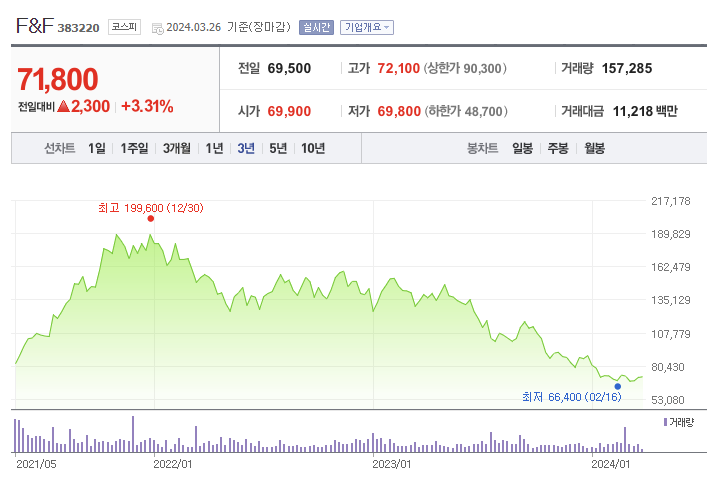 F&F의 주가는 지난 '21년까지는 우상향 하다가, 이후 '22년부터는 지속적으로 우하향하는 모습을 보이고 있습니다. '23년은 '22년대비 성장세가 대폭 꺾였으며, '23년 4분기는 시장 예상치를 13% 하회하는 어닝쇼크라는 분석이 지배적입니다. '24년은 급하게 달려온 F&F가 잠시 쉬어가는 타이밍이 될 듯 하며, 향후 어떤 성장의 모멘텀이 있을지 지켜봐야 하겠습니다.