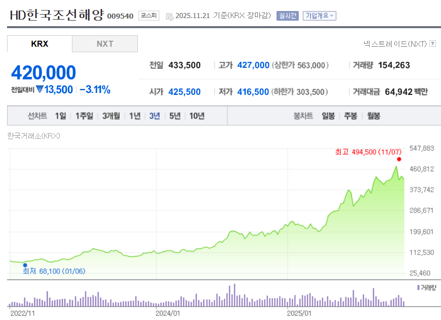 HD한국조선해양의 최근 주가 흐름은 현재 약 42만 원대에서 거래되고 있으며, 지난 1년간 최저 약 18만 1천 원에서 최고 약 49만 4천 원까지의 폭넓은 변동을 보였습니다. 조선·해양 업황의 본격적인 회복과 초대형 원유운반선(VLCC) 수주 등 고부가가치 프로젝트 수주 확대가 주가 상승을 견인하는 주요 요인으로 작용하고 있습니다. 반면 배당수익률이 약 1 %대 초반으로 낮은 수준이며, PER과 PBR 지표 또한 조선업 특성상 업황 사이클에 민감하게 반응하는 구조임을 고려해야 합니다. 또한 원자재 가격 상승, 선가·환율 변동, 글로벌 수주 경쟁 심화 등 외부 변수 역시 주가의 리스크로 상존하는 점은 유의할 필요가 있습니다. 전반적으로 HD한국조선해양은 산업 회복과 기술·수주 모멘텀을 갖고 있어 중장기 성장 관점에서 매력이 있는 종목이지만, 업황 민감성과 변동성도 함께 고려해야 하는 기업입니다.