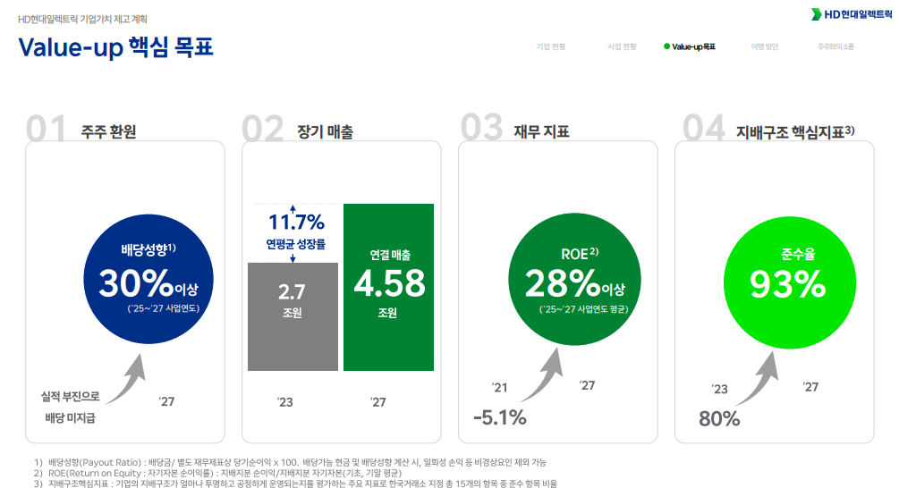 HD현대일렉트릭의 배당 성향은 10% 초반 수준이지만, '25~'27년 3개년동안 배당 성향을 30% 수준으로 향상시킬 계획입니다.