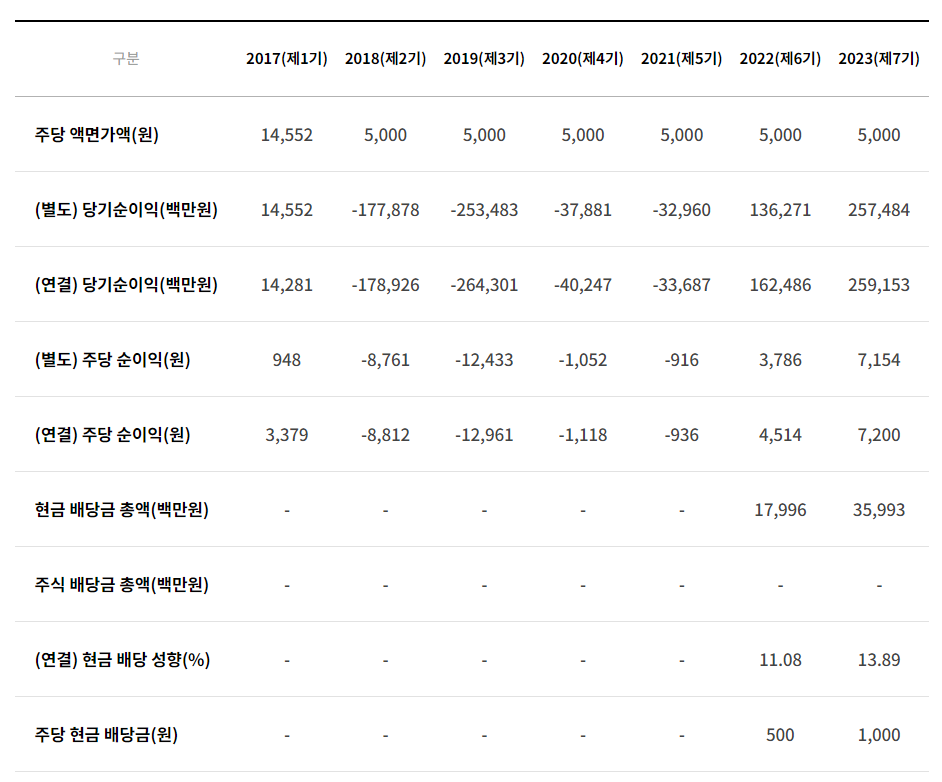 지난 '21년까지는 배당을 실시하지 않았고, '22년부터 배당을 실시하였으나, 배당성향이 10% 초반 수준으로 아직은 주주환원이 미약한 상황입니다.