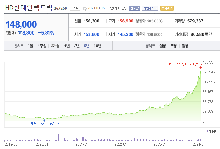 HD현대일렉트릭의 주가는 아래 차트에서 확인할 수 있는 바와 같이, 지난 '20년부터 지속적으로 우상향 및 급등하는 모습을 보이고 있습니다. 이는 ChatGPT 등 AI가 시장이 성장하면서 전력설비 관련 수요가 늘어날 것이란 기대감 때문입니다. 하지만 주가가 지나치게 급등한 모습도 있어, 투자는 신중하게 해야 할 필요가 있을 것 같습니다.