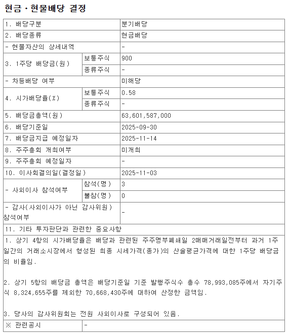 → 산업 경기 회복과 실적 개선 흐름 속에서 분기배당을 확정했다는 점은 배당 안정성 강화 및 주주환원 의지 표명으로 해석됩니다.