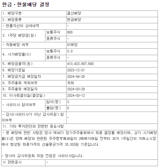 | HD현대 2023년 실적 및 배당금 공시!! (결산, 분기배당, 반기배당, 주가, 배당소득세, 배당락, 배당일) (0) | 2024.03.09 |