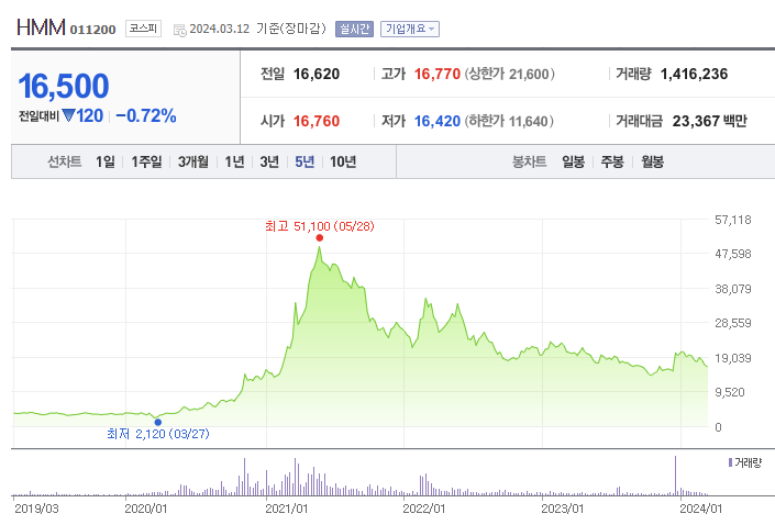 HMM의 주가는 2019년까지 지속적으로 횡보하다가, 20202년 팬데믹을 기점으로 폭등하였습니다. 팬데믹 시기 공급망 이슈가 발생하며 엄청난 해상 운임 상승이 있었고, 이 시기에 HMM을 포함한 전 세계 주요 선사들은 대부분 역대급 실적을 기록하며, 주가 또한 함께 상승하였습니다. 다만, 팬데믹 기간이 지나며 공급망 혼란이 줄어들고 해상 운임이 감소하며, HMM의 주가 역시 상승분을 반납하고 지속적인 보합세를 기록 중입니다.