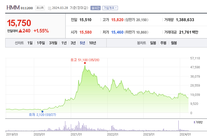 HMM의 주가는 지난 팬데믹 기간 공급망 혼란에 따른 운임 폭등으로 실적 및 주가가 급등하였다가, 이후 팬데믹이 끝나고 공급망 혼란이 완화되면서 주가 역시 하락 후 보합세를 유지하고 있습니다. 최근에는 매각을 추진하였다가, 견해차를 좁히지 못 하고 협상이 결려되며 매각이 잠시 중단 되었습니다.