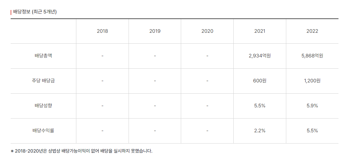 HMM은 이전까지는 배당가능 이익이 없어 배당을 진행하지 못 하다가, 2021년부터 지속적으로 배당을 지급하고 있습니다.