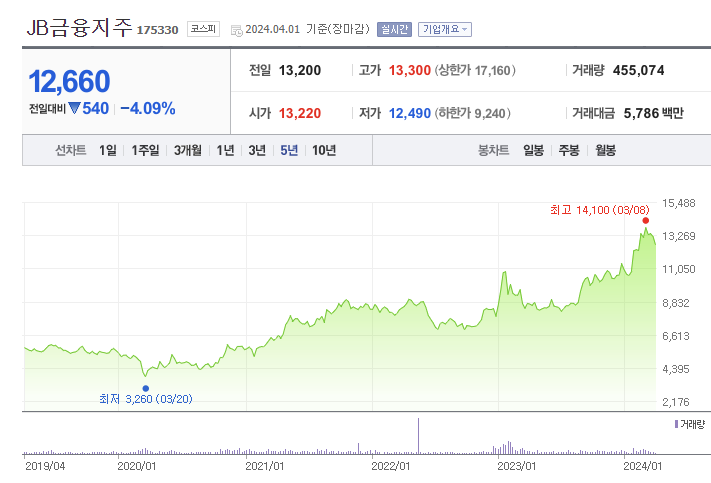 JB금융지주 주가 (출처 : 네이버 증권)