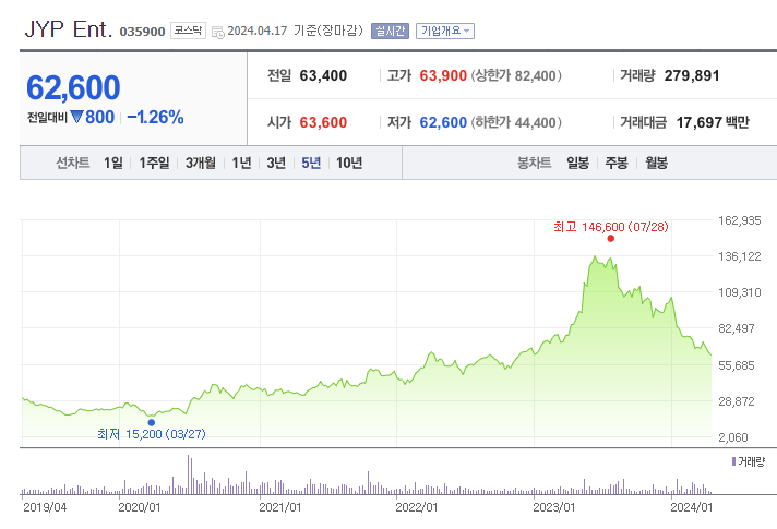 JYP엔터테인먼트의 주가는 '23년 중순까지 지속 우상향 하다가, 이후 소속 아티스트들의 컴백 실적이 좋지 않으며 우하향 하는 모습을 보이고 있습니다. 현재는 저평가라고 보는 의견과 그 동안 고평가 받은 주가가 내려오는 중이라는 의견이 대립하는 가운데, 향후 JYP의 주가는 어떻게 될지 향방을 지켜봐야 하겠습니다.