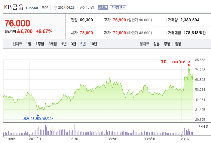 지난 5년간의 KB금융 주가를 살펴보면, 타 종목 대비 큰 변동 없이 보합세를 유지하고 있습니다. 사실 그래서 주식 자체의 매력이 크지는 않았지만, 최근 저PBR 종목들이 각광 받으면서, 금융주 중 대장주인 KB금융의 주가도 급 상승하는 모습을 보이고 있습니다.