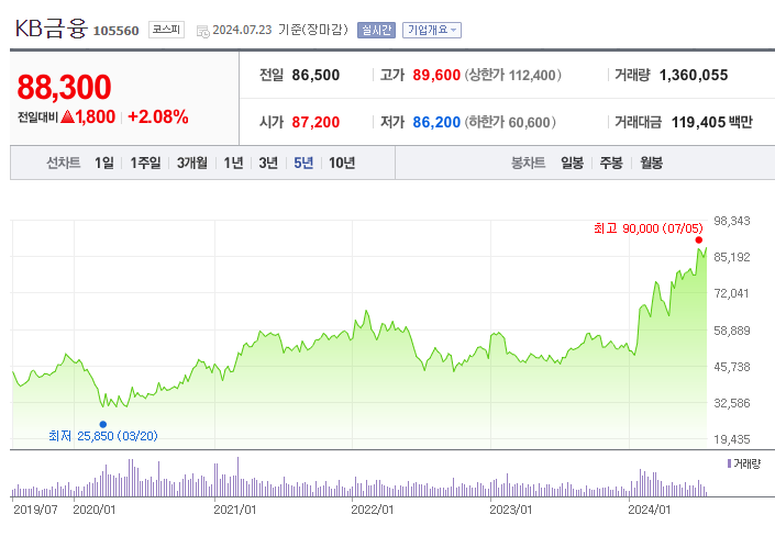 '23년까지의 KB금융 주가를 살펴보면, 타 종목 대비 큰 변동 없이 보합세를 유지하고 있습니다. 사실 그래서 주식 자체의 매력이 크지는 않았지만, 최근 밸류업 프로그램으로 인해 저PBR 종목들, 특히 금융주가 각광 받으면서, 금융주중 대장주인 KB금융의 주가도 급 상승하는 모습을 보이고 있습니다.