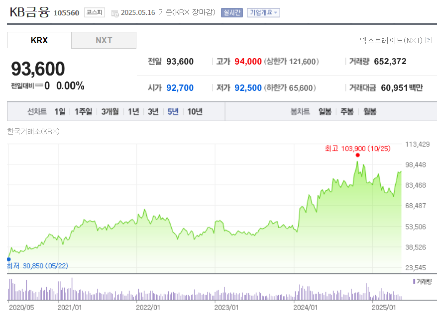 2025년 5월 기준, KB금융의 주가는 93,600원으로 거래되고 있습니다. 1년 기준으로 보면 약 15% 상승한 모습이지만, 올해 들어서는 오히려 하락세를 보이며 4대 금융지주 중 가장 큰 하락폭을 기록했습니다. 아래 수치만 보더라도 주가가 다소 저평가되어 있다는 것을 알 수 있습니다.