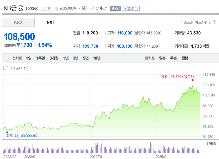 KB금융의 주가는 최근 약 108,500원대를 기록하며, 52주 최고가는 126,600원, 최저가는 69,300원 사이에서 등락하고 있습니다. 2025년 2분기에는 순이익이 1조 7,384억 원으로 분기 기준 사상 최대 실적을 달성했고, 상반기 누적 순이익도 3조 4,357억 원으로 전년 대비 23.8% 증가했습니다. 특히 비이자이익 증가로 순수수료이익이 1조 원을 돌파하며 실적 안정성을 강화했습니다. PBR이 0.73배, PER은 8.67배 수준으로 평가받고 있어, 여전히 저평가된 배당주로 여겨지고 있습니다. 하반기에는 8,500억 원 규모 자사주 매입·배당확대 계획도 발표되어 투자 매력도가 한층 높아진 상태입니다.