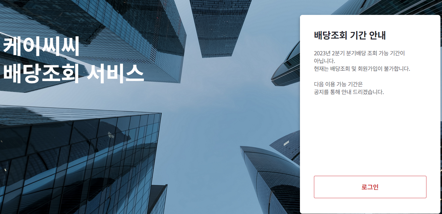 혹시라도 배당금 지급 대상인지 헷갈리신다면, KCC 배당조회 Web Service를 통해 배당금 지급 대상인지 확인 가능합니다. 다만, 현재는 조회가 불가하며, 배당 일정이 발표된 이후 조회가 가능합니다.