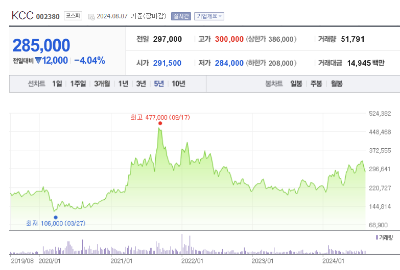 KCC의 최근 5년간의 주가를 보면, 코로나 기간에 부침을 다소 겪긴 했지만, 현재는 코로나 이전과 비슷한 수준의 주가를 유지하고 있습니다. 현재는 크게 주가가 상승할만한 소재가 보이지 않아 투자 목적으로는 신중하게 접근해야 할 것으로 보입니다.