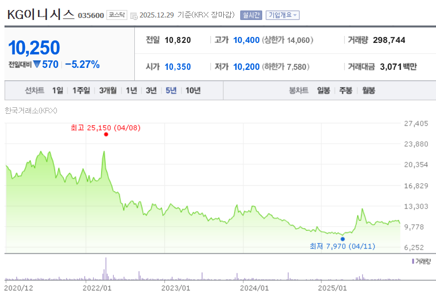 KG이니시스의 최근 주가는 약 1만 원대 초반에서 거래되고 있으며, 지난 1년 동안 약 7,970원에서 1만 3,070원 사이의 변동폭을 보였습니다. 전자결제 및 핀테크 서비스 기업으로 온라인·오프라인 결제 수요 확대가 주가 상승의 중요한 배경 요인으로 작용합니다. 밸류에이션 측면에서는 PER과 PBR이 업종 평균 대비 낮은 편에 있어 상대적으로 저평가 구간이라는 평가가 나옵니다. 배당수익률은 약 4%대 중반 수준으로 안정적인 편이며, 주주환원 정책이 긍정적으로 언급되기도 합니다. 다만 결제시장 경쟁 심화, 기술 변화, 규제 환경 변화 등 전자결제 업종 특유의 리스크는 주가 변동성을 높일 수 있는 요인입니다. 전반적으로 KG이니시스는 결제시장 성장 기대와 저평가 매력을 갖춘 종목이지만, 외부 변수에 따른 변동성 역시 유의해야 하는 기업입니다.