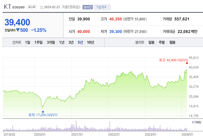 KT의 주가는 지속적으로 보합권을 유지하고 있었으나, 최근 AI 관련주로 등극 및 주주환원 정책에 힘쓰며 2013년 이후 처음으로 주가가 4만원을 넘어 섰습니다. (2/23 기준)