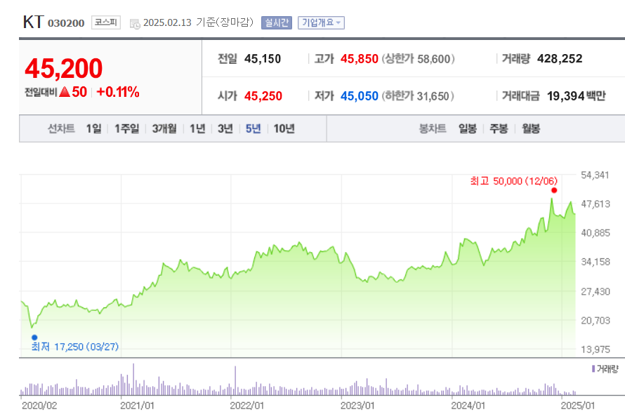 KT의 주가는 지난 '24년 1월 전고점을 기록한 뒤, 하락세를 보인 후 다시 우상향 하는 모습을 보이며 고점을 형성하고 있습니다. 이는 KT가 올해부터 분기 배당을 실시하며 주주환원에 힘쓰는 모습과 더불어, 역대급 실적을 기록한 것도 한 몫을 했습니다.  또한, KT가 마이크로소프트와 함게 대대적인 AI  생태계 구축에 나선 점도 주가 상승에 영향을 끼친 것으로 보입니다.