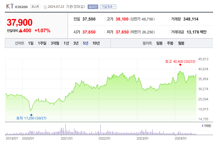 1. KT 주가KT의 주가는 지난 '24년 1월 전고점을 기록한 뒤, 주주환원에 힘쓰고 있음에도 하락세를 보인 후 일부 회복하는 모습을 보이고 있습니다. 이는 국민연금의 지분 매각으로 최대주주가