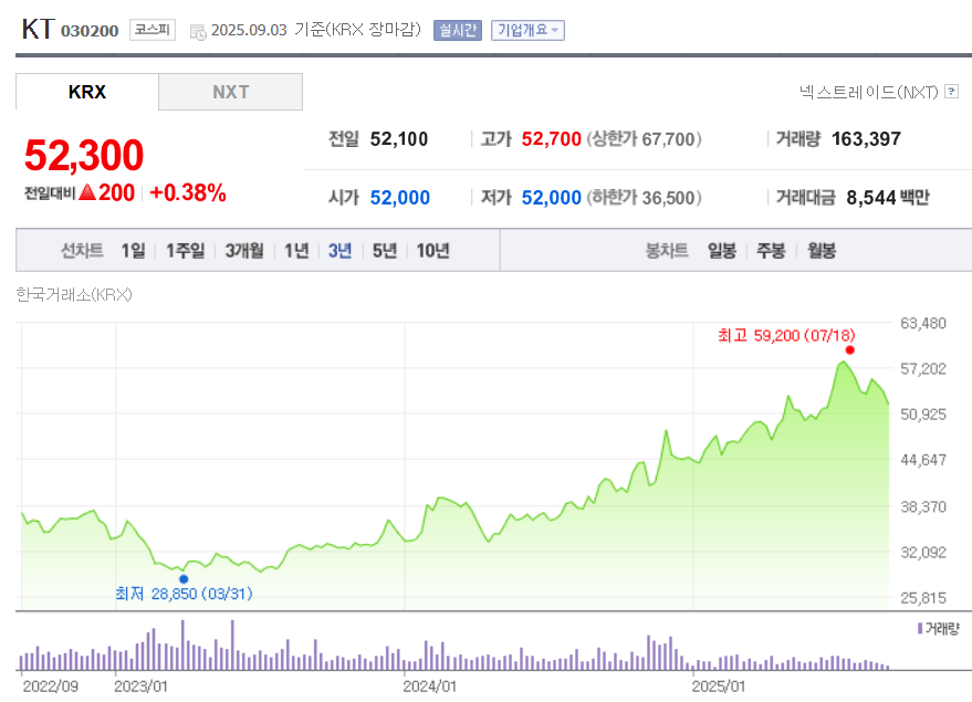 KT의 주가는 현재 52주 범위인 약 39,300원에서 59,200원 사이에서 움직이며, 최근 약 52,300원 수준에 머물러 있습니다. 2025년 2분기에는 영업이익이 전년 대비 105% 급증한 1조 148억 원을 기록하는 등 역대 최대 실적을 달성했고, AI 및 통신 핵심 사업이 실적 성장을 견인했습니다. 특히 2분기 배당을 600원으로 인상하고 자사주 매입 계획을 발표하는 등 주주친화 정책이 강화되면서 투자 매력도 상승 중입니다. 다만, 외인 매도와 높은 마케팅 비용 등으로 인해 불확실성에 따라 주가가 민감하게 반응할 가능성이 높다는 전망도 있습니다. 전반적으로, KT는 실적 호조와 신사업 성장, 주주환원 정책을 기반으로 밸류에이션 재평가 기대가 있는 종목으로 평가됩니다.