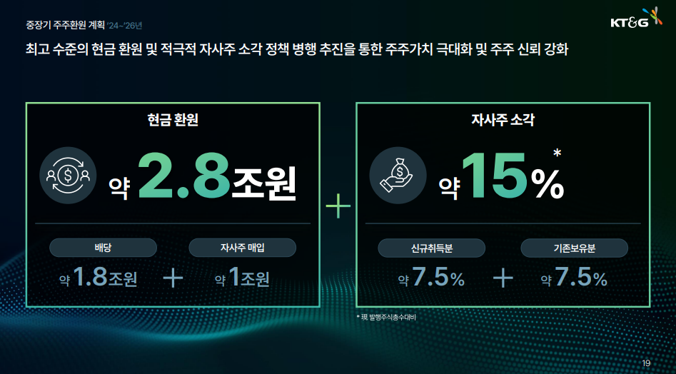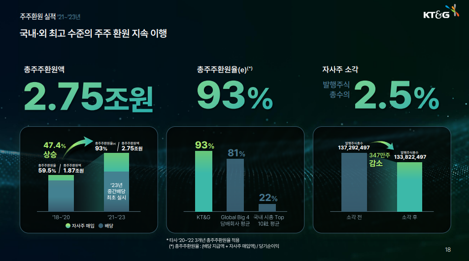 KT&G는 장기적 관점의 주주가치 제고에 대한 강한 의지를 표명하며, 향후 3년간('24~'26년) 약 1.8조원의 현금 배당과 약 1조원 규모의 자사주 매입‧소각 등 약 2.8조원 규모의 주주환원 계획을 발표했습니다.