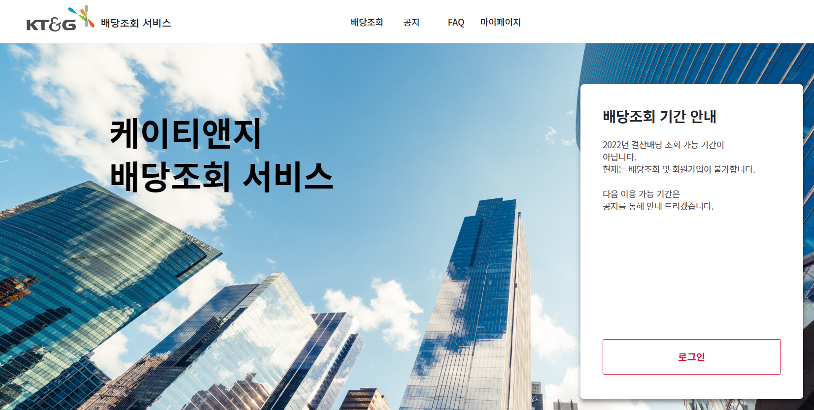 혹시라도 배당금 지급 대상인지 헷갈리신다면, KT&G 배당조회 Web Service를 통해 배당금 지급 대상인지 확인 가능합니다.다만, 지금은 조회가 어려우며, 향후 배당액 및 일정이 공지 된 후 오픈될 예정입니다.