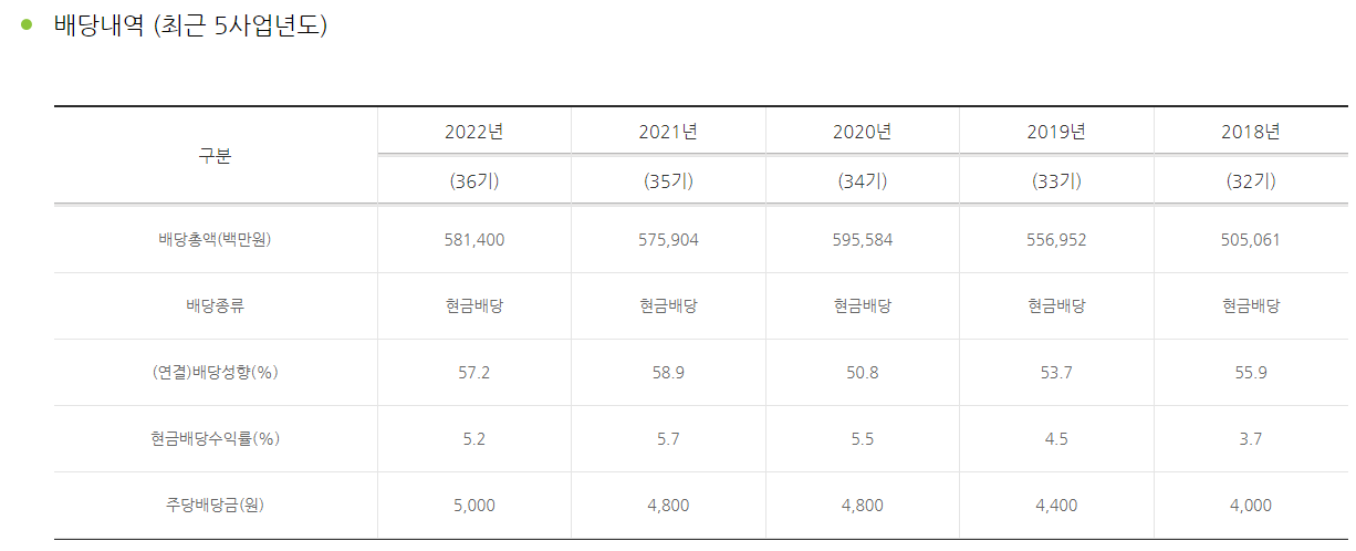 배당금 : 1,200원 (연간 4,000~5,000원 사이의 배당금 지급에 비추어 볼 때, 올해 반기 배당 1,200원은 다소 낮은 수준)