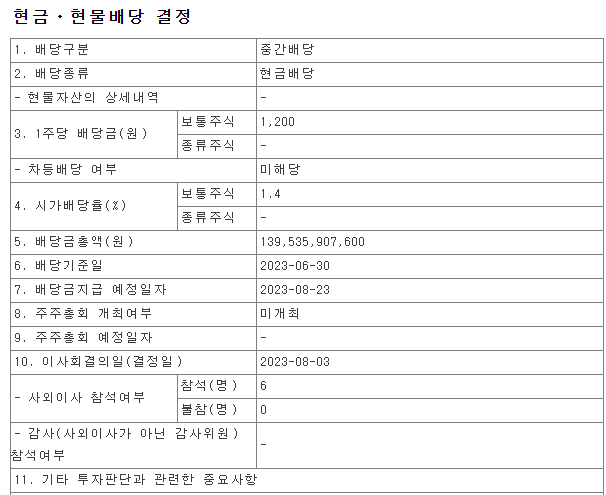 배당금 : 1,200원 (연간 4,000~5,000원 사이의 배당금 지급에 비추어 볼 때, 올해 반기 배당 1,200원은 다소 낮은 수준)