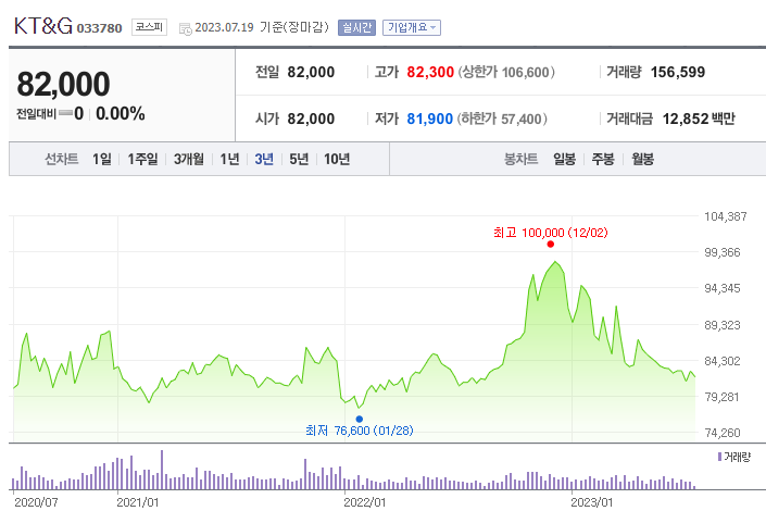 KT&G 주가 KT&G의 최근 3년 주가를 보면, 작년 말에 최고점을 기록한 것을 제외하고 크게 변동이 없이 주가가 비슷한 수준에서 유지되고 있는 모습을 볼 수 있습니다. KT&G는 사실 주가 상승보다는