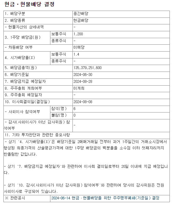 2.  2024 년 상반기 KT&G 중간/반기배당