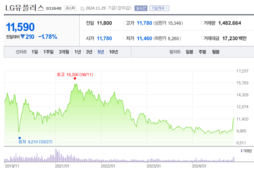 1. LG유플러스 주가LG유플러스의 주가는 지난 팬데믹 기간 전고점을 기록한 이후, 지속적으로 하향세를 보이고 있습니다. 경쟁사인 KT와 SKT는 AI 관련주 분류 등으로 일부 상승 또는 보합세를 나